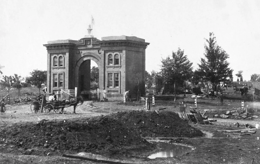 Elizabeth was still the caretaker of the Evergreen Cemetery since her husband was still away and fighting elsewhere. She had a message from Mr. McConaughy, who was the president of the cemetery, that she should, and he quoted “Hurry on home (which was the Evergreen Gatehouse and grounds), there is more work for you than you are able to do”. In total, there were 34 dead horses that strummed the grounds adjacent to the cemetery, along with several tens of soldiers. The mounds of dirt that are in front of the dirt road with the horse and wagon on it are not burial graves. These mounds are called “lunettes”. These lunettes are a semi-circle around for the cannons to hide in and not be exposed to open musket fire from the enemy approaching.