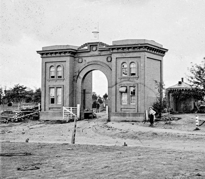 The little shed that’s behind the man standing next to the Evergreen Gatehouse is the pump shed. Behind that would be the graves of at least 15 soldiers. In between the archway of the Gatehouse in this picture, you may have to zoom in, but it’s a soldier standing on guard. You can also view that most of the windows have been blown out by gunfire or cannon fire explosions. The results of blown out windows are the following: bugs and flies flying around inside and out with the smell of the blood and the stench of the bodies, the heat and humidity making everything sticky, the rain blowing into the house during thunderstorms. The good news with the windows being blown out: new windows and the wind blowing the stench in or out.