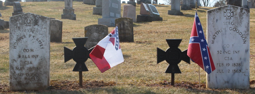 There is one folk-lore of Union and Confederate graves and that is evident with Evergreen Cemetery as well. There are two Confederate graves that Elizabeth Thorn and her father dug and buried. Their gravesites are below: