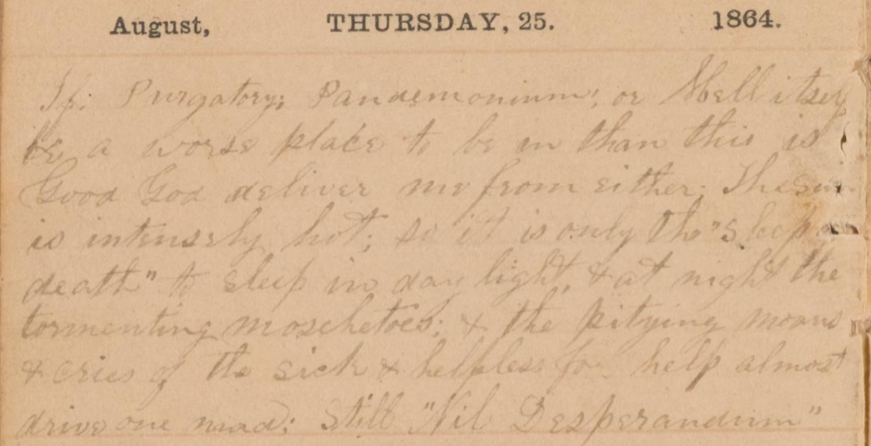 Here is a diary page from Samuel J. Gibson, a soldier serving with Company B of the 103rd Pennsylvania Infantry Regiment. Every day, he would write in his diary to his wife about the conditions at Andersonville. This was the notation on Thursday, August 25, 1864: