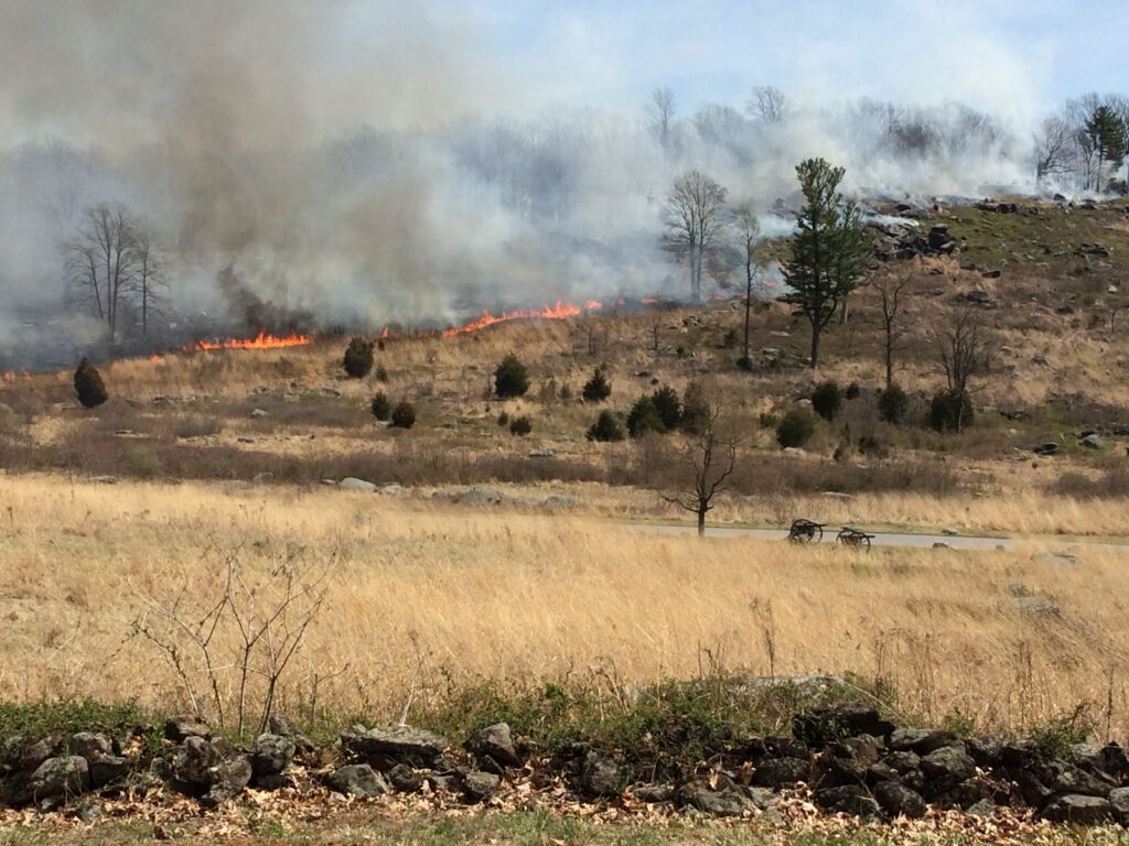 Every few years, the Park Service wants to get invasive plants and weeds out of the park. The only way they can do this safely is to have a prescribed burn. Firefighters and park service officials have to wait for the right weather, drier humidity and calm winds to do this important act for the landscape. This was a prescribe burn in April 2017. Minus the fire that is burning, it shows the smoke across the fields. You can argue that it might look like this in July 1863 with the firing of the cannons across the battlefield.