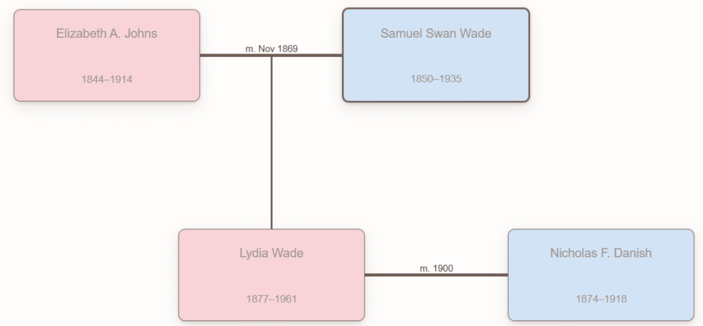 Sometime between 1869 and 1877, they traveled out west and resided in Indiana and Illinois. They would have a child, Lydia Wade Danish. Lydia would marry Nicholas Danish (1874-1918). All four of them are buried in Illinois.