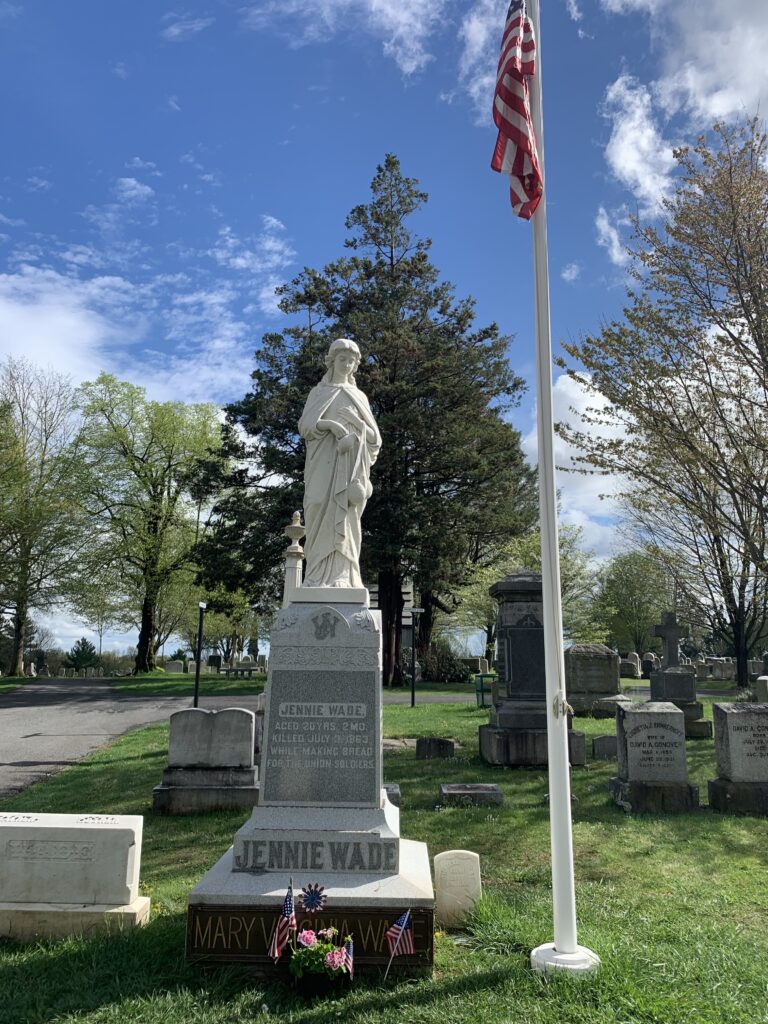 Her final resting place is within the Evergreen Cemetery in November 1865. She was buried between her parents and her uncle. Mary Virginia “Jennie” Wade was then buried here. Sometime in 1901, the Woman’s Relief Group of Iowa, which one of its members was Georgeanna Wade McClellan, the current monument is placed at her gravesite. About a decade later, the flag-post and the American flag was installed. Her flag is one of two in the United States that is flown 24 hours every day for every day of the year. The other flag is at Betsy Ross’s gravesite.