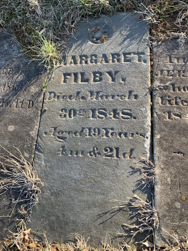 Mary Ann Filby (1820-1892) was born on a farm south of Gettysburg. Her family possibly lived along the Taneytown Road near the present day Links of Gettysburg Neighborhood. This farm is just north of the Mason-Dixon Line between Pennsylvania and Maryland. Her parents, Samuel Filby (1796-1873) and Elizabeth Degroft (1788-1887) had three children together. Mary Ann was the first daughter they had. Her family lived in poverty and lived a tough, rough life. Her sister, Margaret Filby was born in 1829, but only lived to 1848. She never married. She was first buried at the High Street Cemetery behind the church that still stands. However, with development in Gettysburg, the burials were reburied within the Evergreen Cemetery. Her burial site is with the other reburials from the church show below.