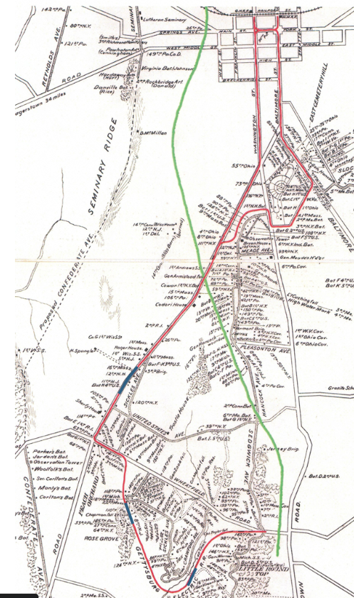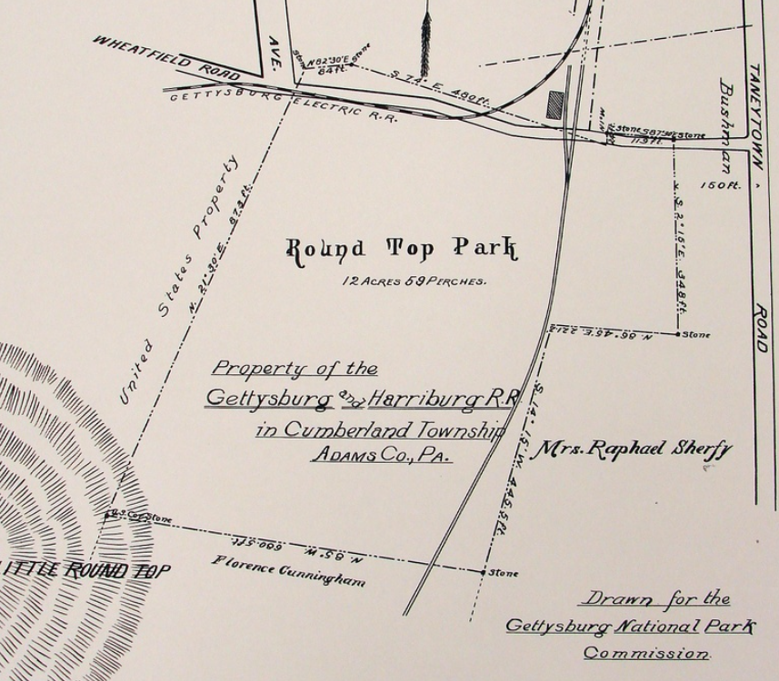 The Gettysburg and Harrisburg railroad had multiple railroad lines through the town of Gettysburg when it first developed. I’ve already talked about the north to south railway line from the two towns. The other was the “spur” that connected the town towards the battlefield. Now, let’s talk about the railway line that went from the spur to the Round Tops. The map below shows two highlighted areas. The red lines are the Gettysburg Electric Trolley tracks. The green line shows the approximate location of the railroad tracks through the battlefield and ending behind Little Round Top.