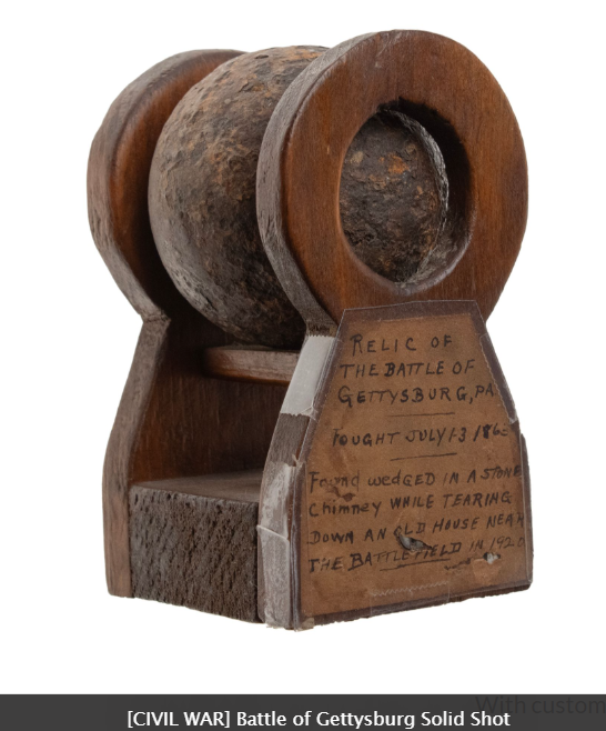 Depending on the size of the solid shot, the relics are quite expensive to find a solid shot that still looks like it could be fired. In 2020, a local artillery store in Gettysburg called the Horse Soldier sold a 6-pound solid shot for $900. The solid shot relic was found by a local resident named Al Flickinger near the southern edge of the Peach Orchard. Here is it shown below.