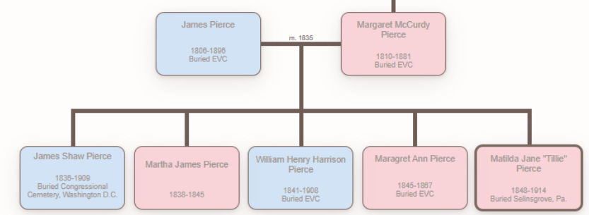 James Pierce and Margaret McCurdy married in 1835 or 1836. They lived on Baltimore Street and would have seven children, but only four of them reached adulthood. Looking at the four children, here is the family tree.