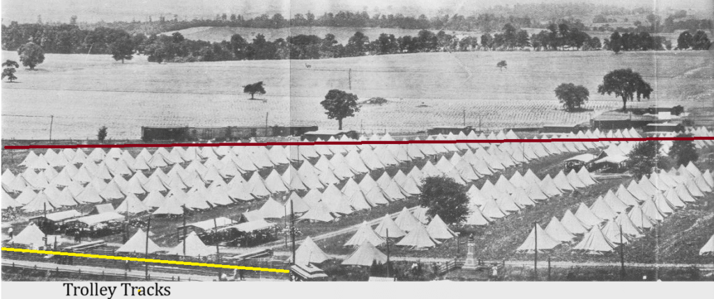 Ohio monument shown below would be the the location of the Emmitsburg Road heading southward. Along the road would be the trolley tracks (shown in yellow) with a trolley entering the picture. The red line past the tents would be the steam-locomotive railroad of the Gettysburg and Harrisburg Railroad towards the spur in town. The kris-cross of these two tracks would be near the Colonel George Ward monument just north of the Codori farmhouse.