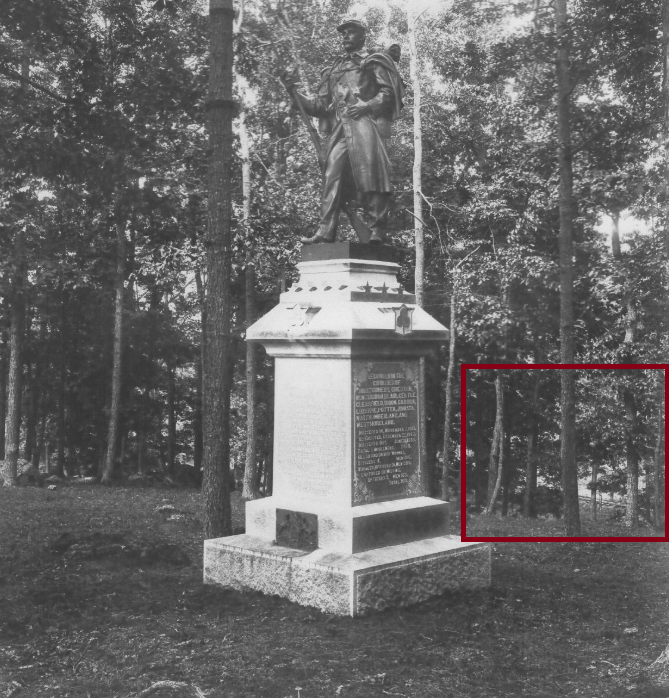 Here is a picture of the trolley railway through the trees near the 53rd Pennsylvania on Brooke Avenue. Below the monument is a large elevation change down the side of the hill. At the bottom of the hill is a trail that once was the trolley tracks. In this picture, you can see the trolley tracks through the trees.
