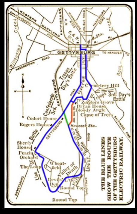 Here is a map of the trolley route from Gettysburg to Round Top Park. The blue line shows the route of the trolley.
