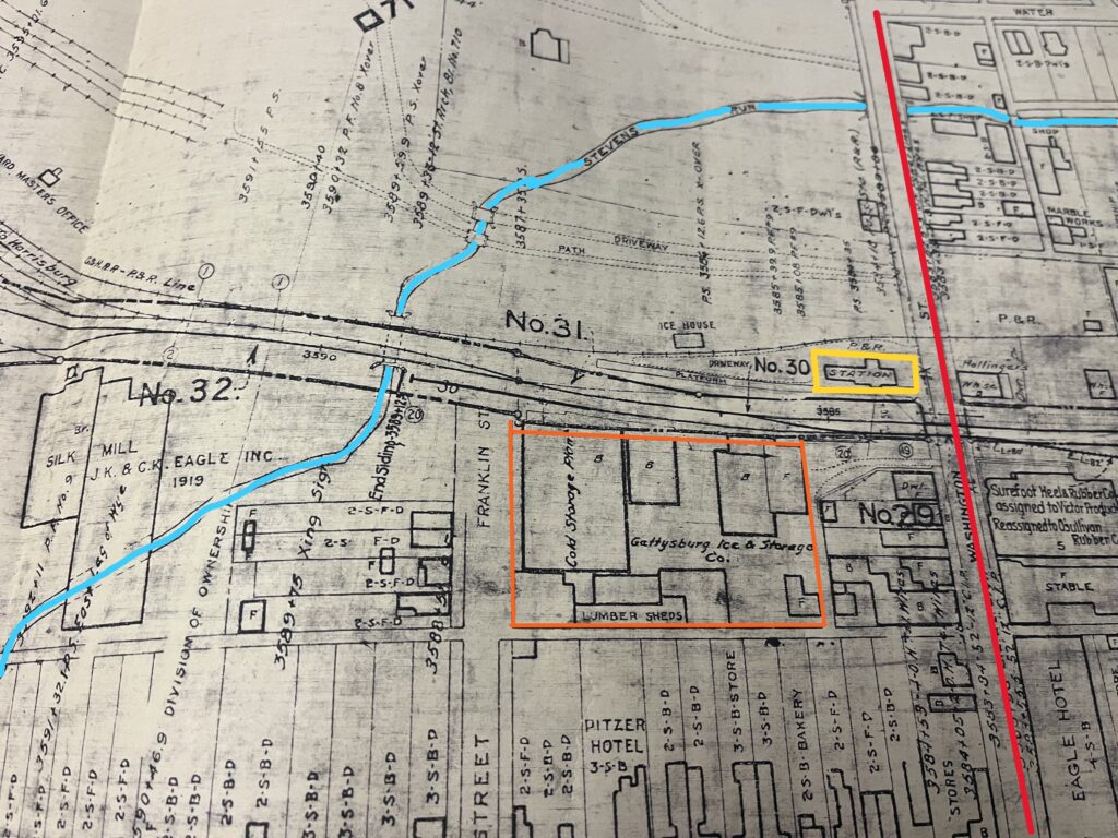 The Red line from north to south on the map is Washington Street. The Blue line is the path of Steven’s Run through the western portions of town. The Yellow box is the current and former location of the Gettysburg and Harrisburg Train Station that was built in the 1880s along Washington Street. I didn’t highlight it, but it also shows the platform for the station for both sets of tracks north and south of the station. The Orange box is the location of the former Gettysburg Ice and Storage Company. Multiple buildings within the “Ice House Complex” are still along the railroad tracks and are used by Gettysburg college students.