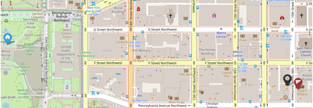 The blue dot (house) is the location of the White House. The red dot (gun) is the location of Ford’s Theatre, and the location of the black dot (bullseye) is the location of the Petersen House.